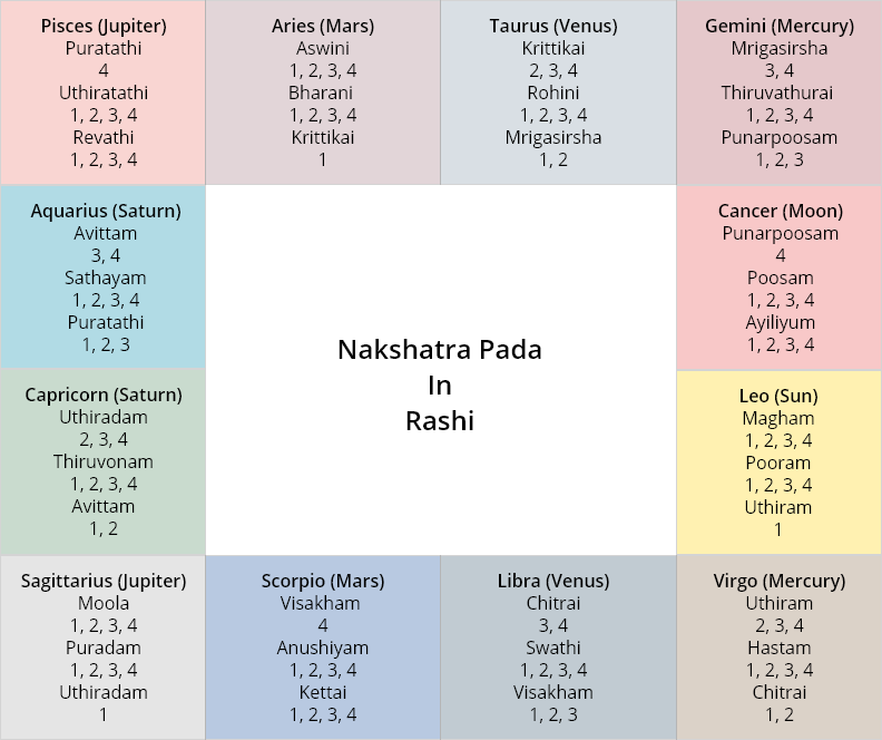 In the 12 houses or Rashis we have a total of 27 Nakshatras or constellations. Each constellation a 13 degrees and 20 minutes of arc. Approximately 2 and half nakshatra occupy one house or rashi. The nakshatra are in turn divided into 4 Padas or quarters.